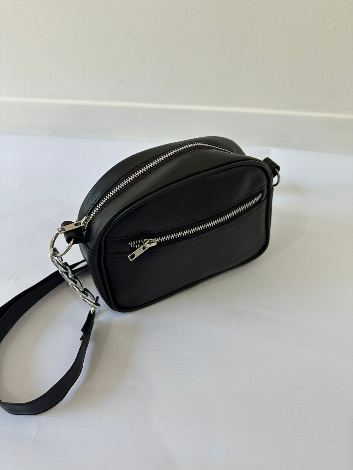 Material: Ecocuero, color negro Cierre Metal YKK Correa regulable Detalles en cadena Reforzada Forrado en su interior con bolsillo exterior Medidas: 15cm de alto x 25cm de ancho